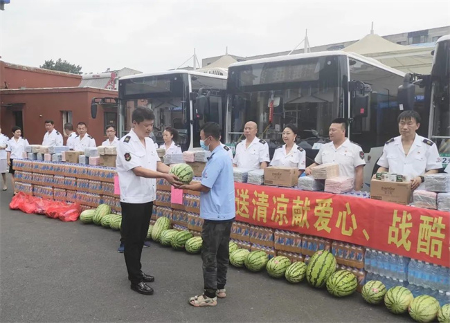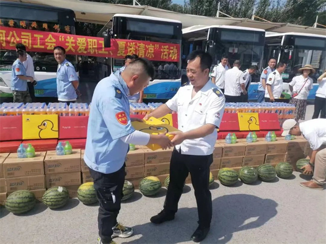 7月28日,沈北公司開(kāi)展了“‘戰(zhàn)酷暑 保安全’送清涼獻(xiàn)愛(ài)心活動(dòng)”。公司工會(huì)為職工們精心準(zhǔn)備了“夏日清涼包”、西瓜、大量的礦泉水,公司負(fù)責(zé)人將“清涼”親自送到職工手中,同時(shí)叮囑車隊(duì)長(zhǎng)合理安排工作,注意防暑降溫,確保職工身體健康。