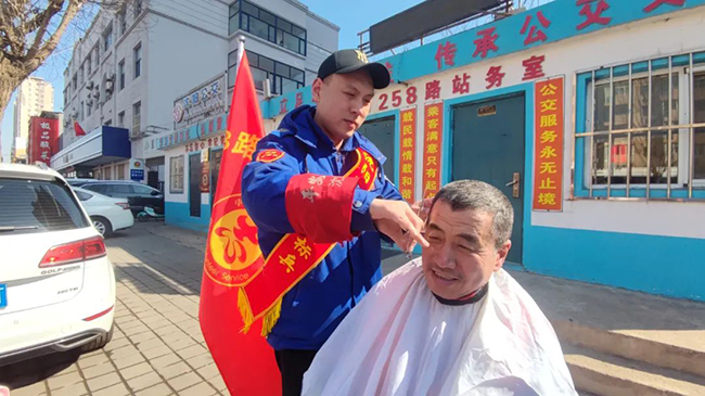 通利、康龍公司258路車隊(duì)的職工們化身志愿者為外地乘客進(jìn)行路線引導(dǎo)咨詢、景點(diǎn)游覽解說(shuō),來(lái)到公交車站附近維持秩序、清潔環(huán)境、擺放共享單車,并為環(huán)衛(wèi)工人免費(fèi)理發(fā)。